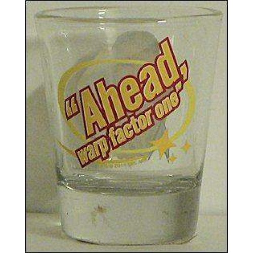 "Ahead, Warp Factor 1!". These words are inscribed on the reverse side of this shot glass!
